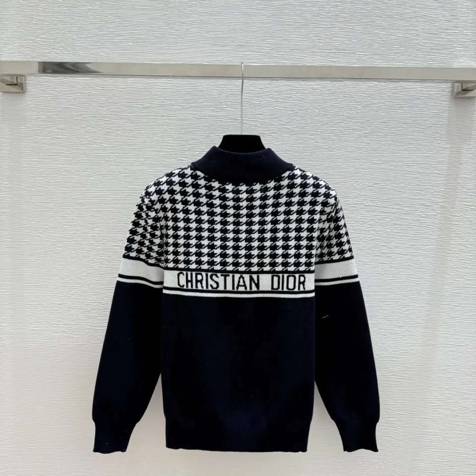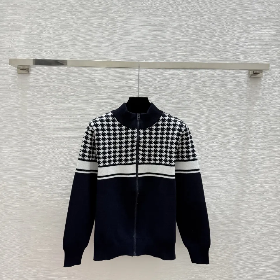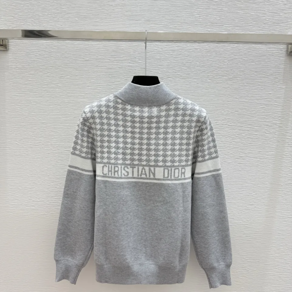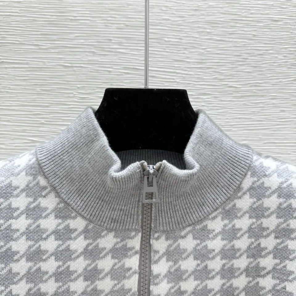 Dior Women's Luxury Houndstooth Knit Zip-Up Jacket Sweater Featuring Elegant Mock Turtleneck and Sophisticated Wool Blend Texture #B56285