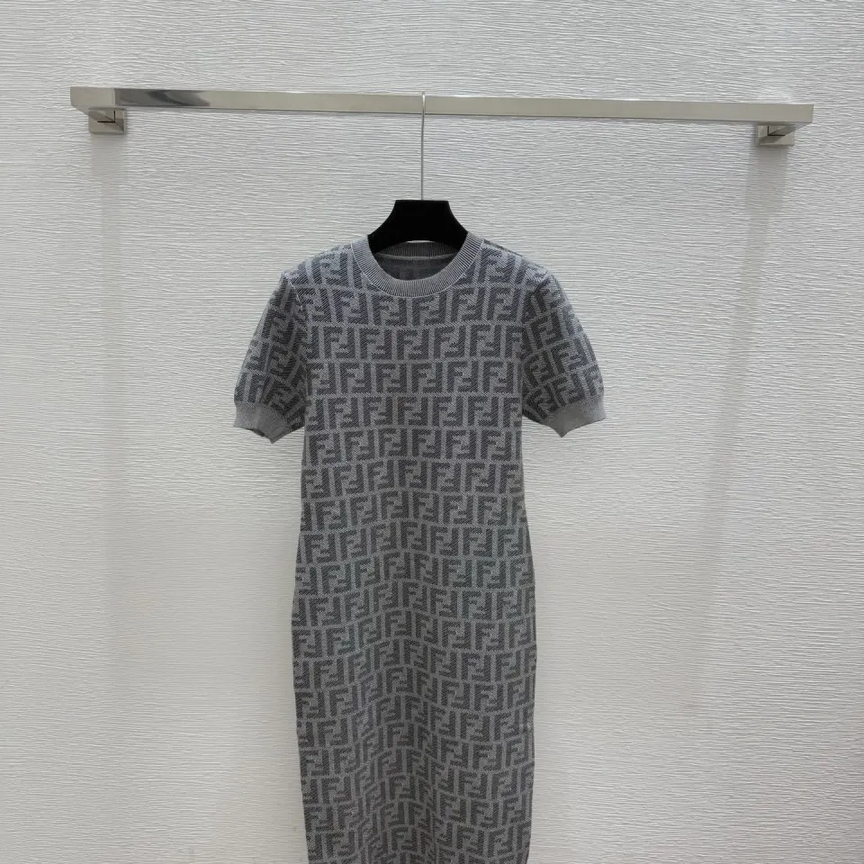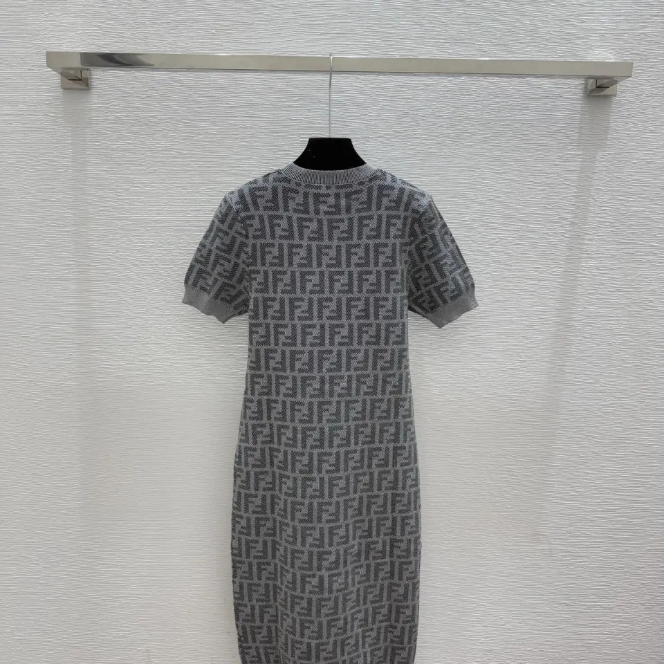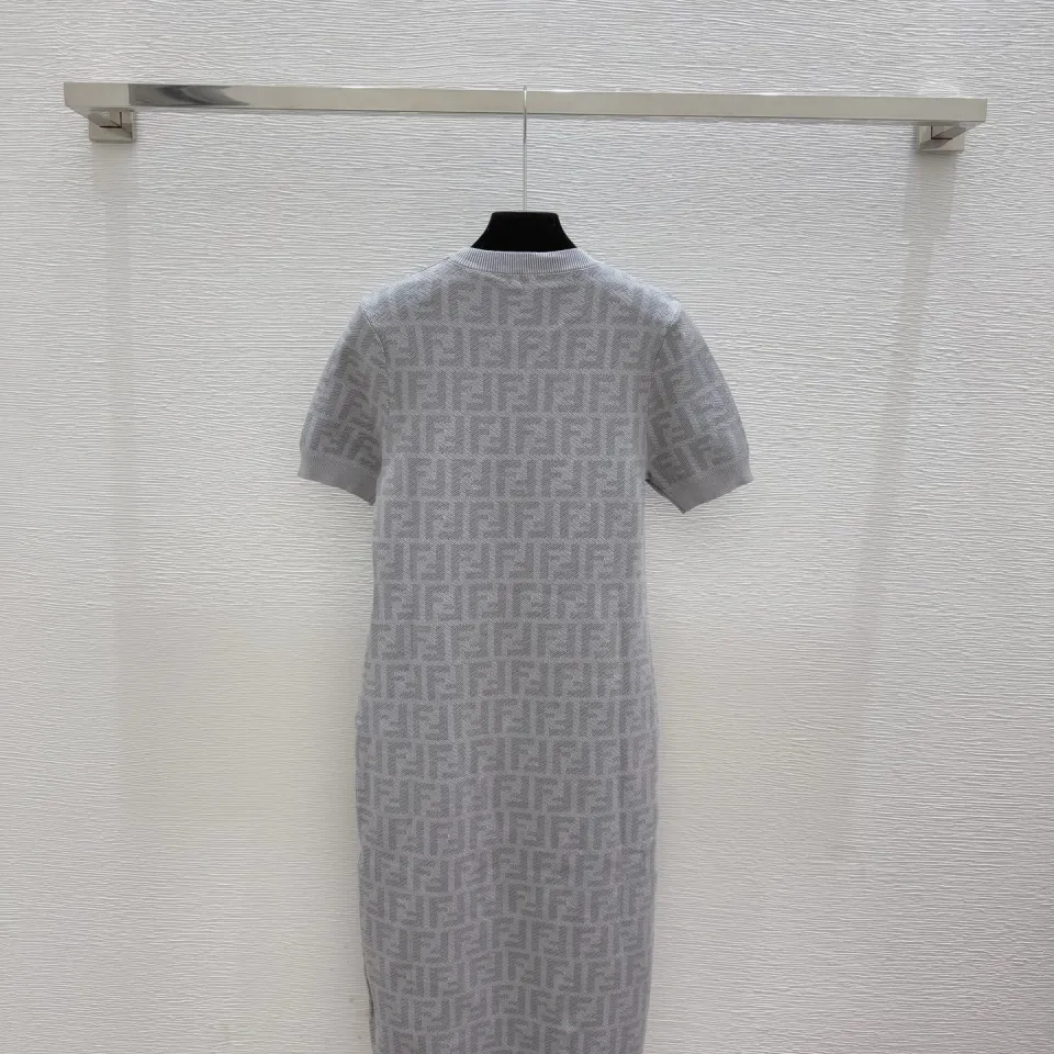 Fendi Women's Luxurious Short Sleeve Knit Dress Featuring Iconic All-Over FF Monogram Jacquard and Elegant Midi Length #B56305