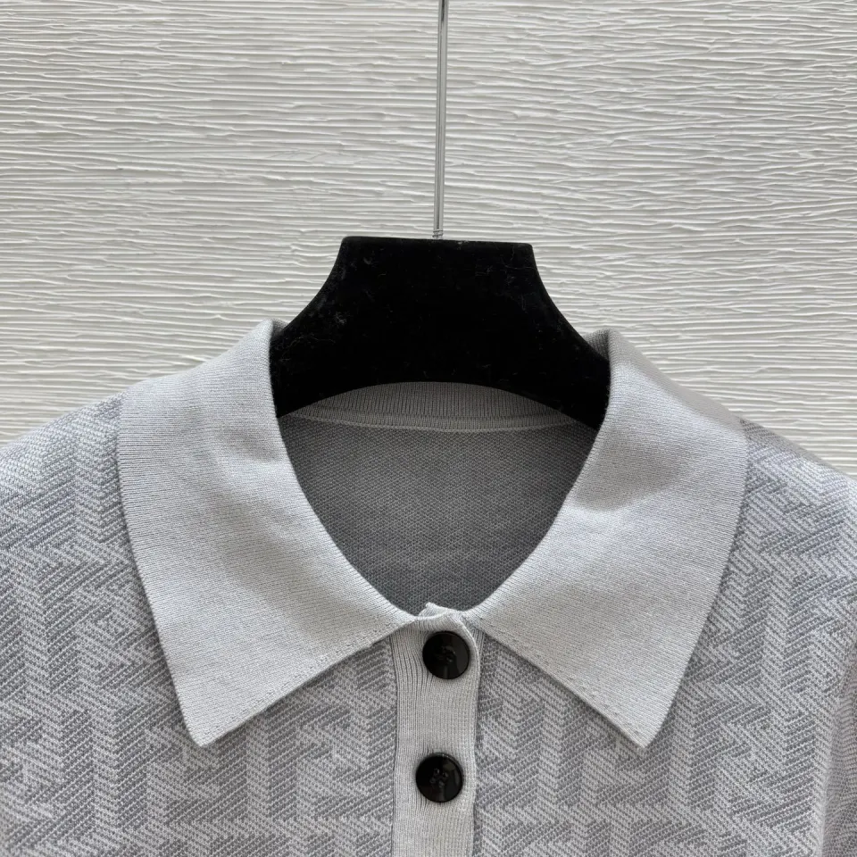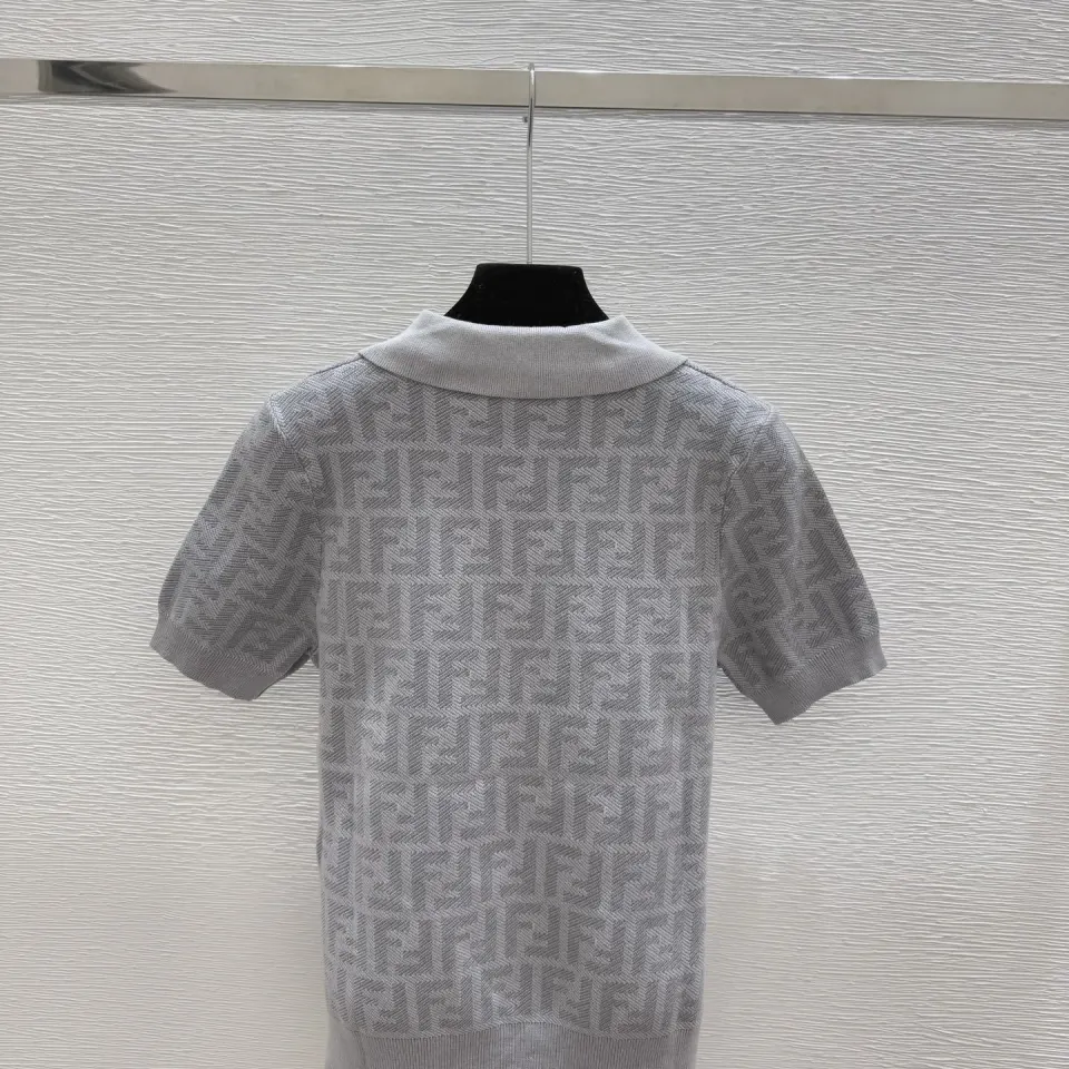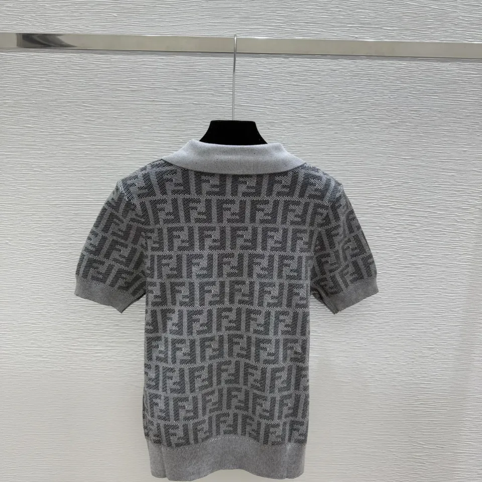 Fendi Women's Luxurious Short Sleeve Knit Polo Top Featuring Iconic FF Monogram Jacquard and Classic Contrast Collar. #B56304